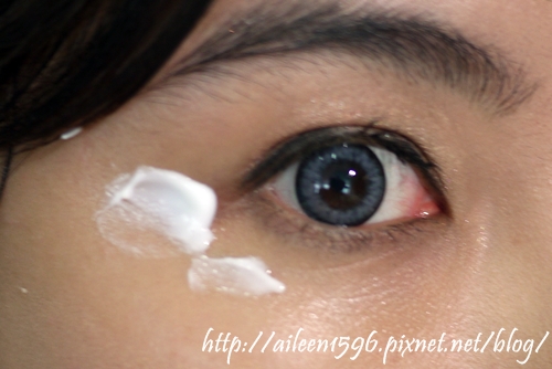 先在眼尾的地方點上活膚霜,然後輕輕的推勻,